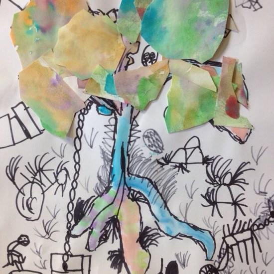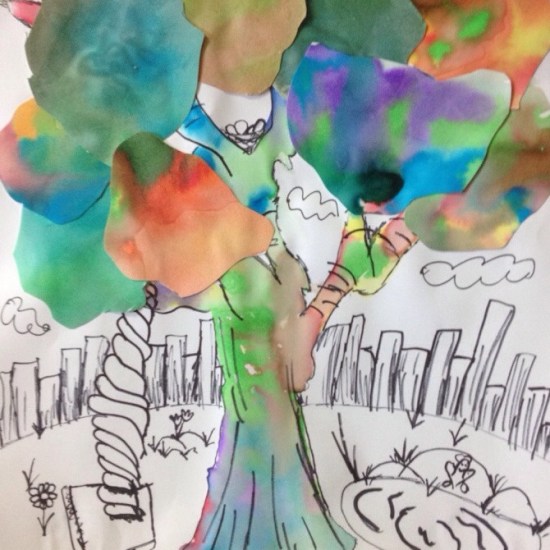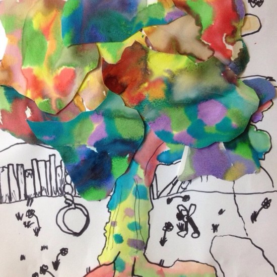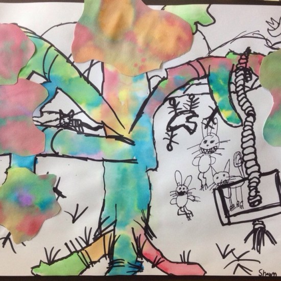 First part of the lesson is the wet on wet technique for painting the tree trunk and branches. We painted another wet on wet paper to cut leaf groups, and details were done with Sharpies.