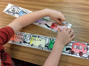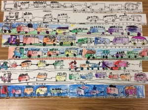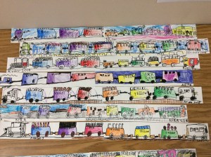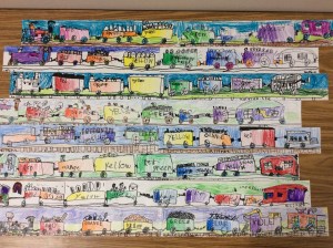 We draw our own train with an engine, 6 train cars and a caboose. Of course there are our own choices of what has filled the cars. Details!