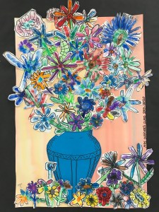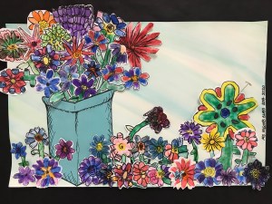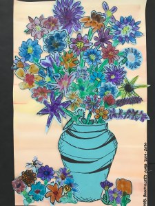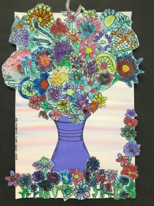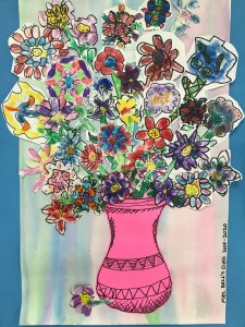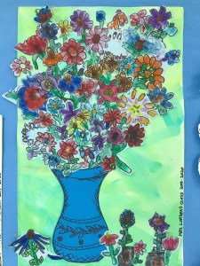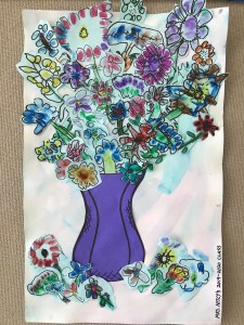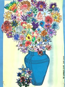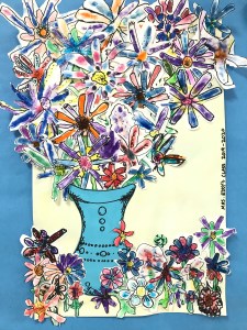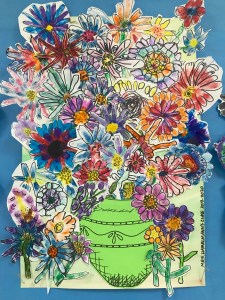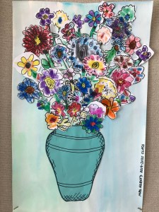 A wonderful co-op lesson making these bouquets that will eventually belong to the classroom teachers. We finger printed with marker ‘juice’ making the basic flower with or without a stem. Then followed up with Sharpie details and skills of cutting out the flower with a halo of the paper, so we don’t cut on the Sharpie line making the flower more vibrant. I decorated most of the vases and we filled the vase and area with all those flowers.
